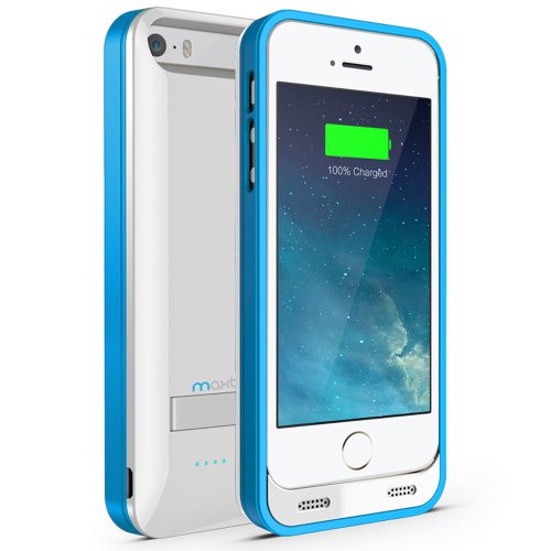Best Maxboost Atomic S External Protective iPhone 5S Battery Case / iPhone 5 Battery Case with Built-in Kickstand - White / Blue (Apple MFI Certified, Fits All Versions of iPhone 5 / 5S - Lightning Connector Output, MicroUSB Input ) [100% Compatible with iPhone 5 / 5S on iOS 7.0+ , Strengthened MicroUSB Input Port, No Signal Reduction]